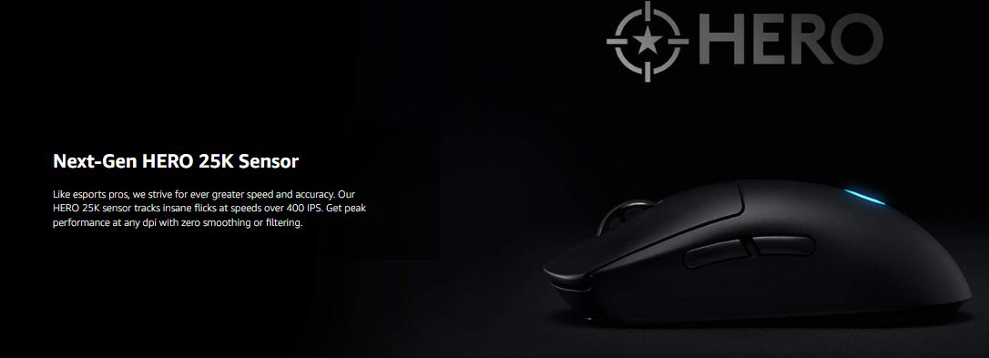 HERO sensor with 100-25,600 DPI resolution and no smoothing/acceleration/filtering for precise control.